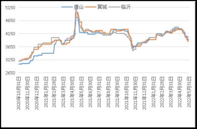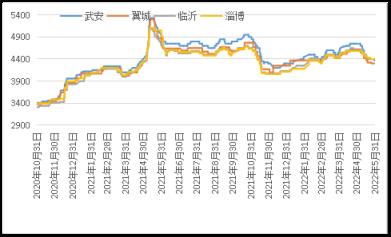 據云商平臺監測數據顯示,截至5月31日,煉鋼生鐵天津地區報價3910元(噸價,下同),較月初跌360元;唐山地區報價3930元,較月初跌370元;翼城地區報價3870元,較月初跌440元;臨沂地區報價4030元,較月初跌320元(詳見圖2)。