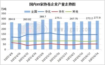 六月份無縫鋼管廠家熱卷產量有所增加,累庫情況有所加重。據云商平臺監測數據顯示,截止6月24日,全國35家樣本鋼企熱卷周產量為277.9萬噸,較5月底增加12.6萬噸。全國35家樣本鋼企熱卷廠內庫存為88.21萬噸,較5月底增加23.71萬噸。
