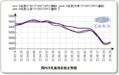 云商平臺監測數據顯示,截至7月29日,全國1.0mm冷軋市場均價為4418元(噸價,下同),比6月末下跌507元。主導城市上海唐鋼1.0mm冷軋卷市場價格為4310元,比6月末下跌540元;北京首鋼1.0mm冷軋卷4410元,比6月末下調590元;天津唐鋼1.0mm冷軋大卷4300元,比6月末下跌580元。